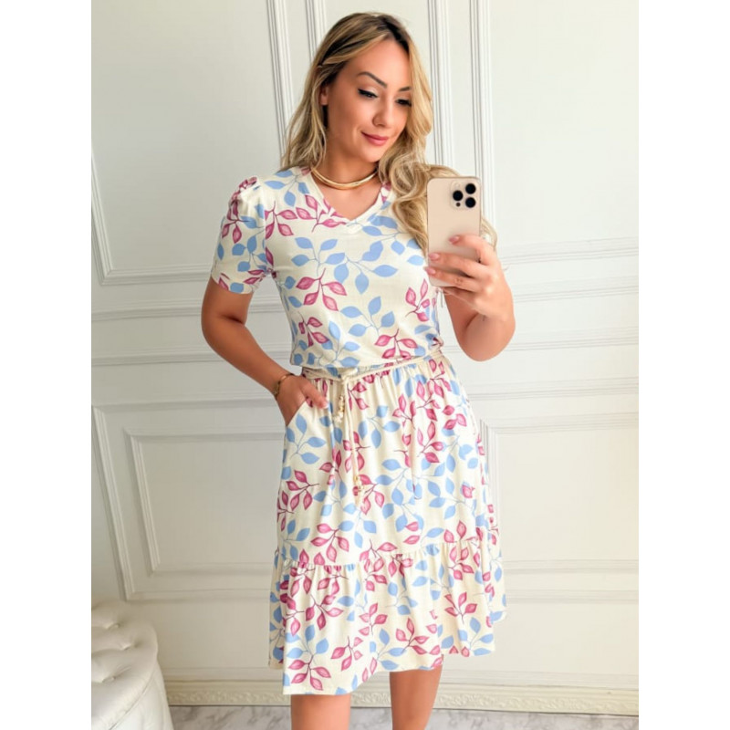 Vestido casual viscolycra estampado, perfeito para um look leve e elegante. Possui decote em “V”, mangas curtas e cintura com elástico que valoriza a silhueta, proporcionando conforto e estilo. A saia com recortes sutis cria um caimento fluido e delicado. Ideal para ocasiões casuais, passeios ou encontros ao ar livre.