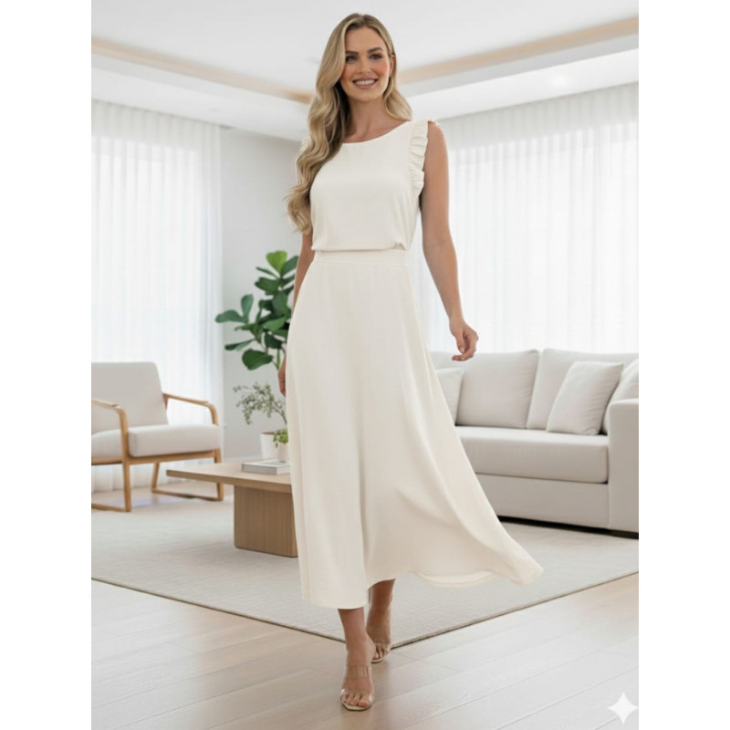 A saia longa proporciona um visual elegante e fluido, enquanto a blusinha com delicado babado nas mangas adiciona um toque romântico e feminino à produção.