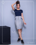Estiloso conjunto feito em malha viscolycra possui blusa azul marinho manga curta com viés cinza. A saia possui comprimento midi com amarrações na cintura, bolsos e vies na cor azul marinho.