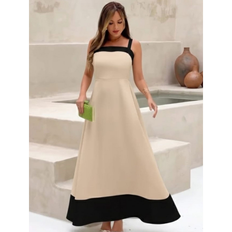 As alças estruturadas e o decote reto oferecem um caimento impecável. Pensando no seu conforto, a peça conta com um elástico discreto na parte de trás, garantindo um ajuste perfeito e maior liberdade de movimento. A saia longa e fluida proporciona leveza e movimento a cada passo.