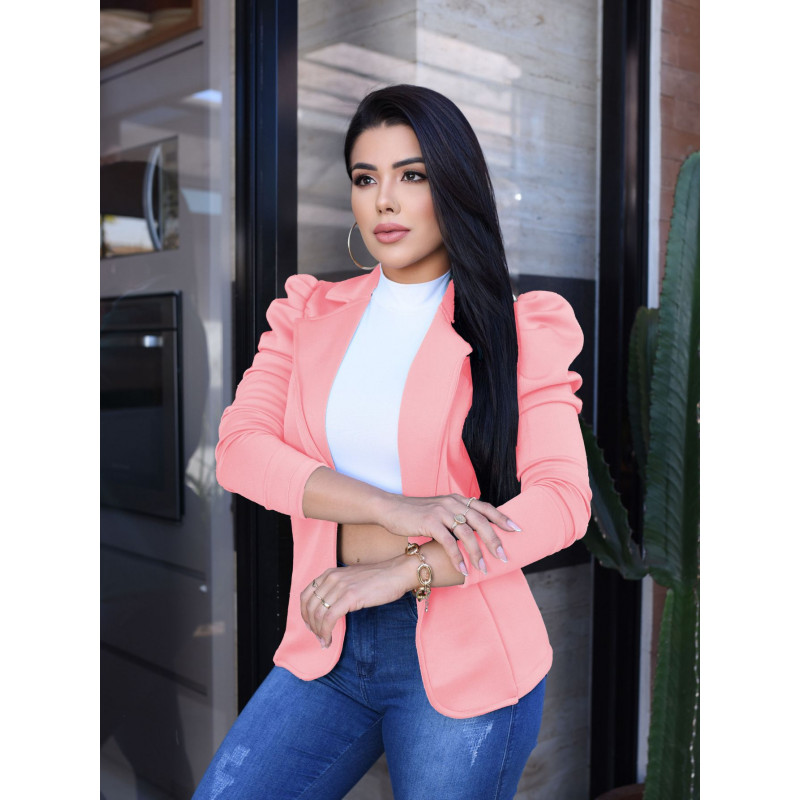 Blazer feminino em tom rosa bebê, confeccionado em tecido leve e estruturado que garante conforto e caimento perfeito. O modelo possui ombreiras sutis que valorizam a silhueta e trazem um toque moderno e sofisticado ao visual. Apresenta corte acinturado, lapela clássica e acabamento impecável.