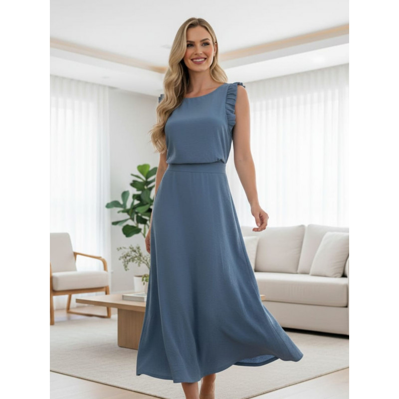A saia longa proporciona um visual elegante e fluido, enquanto a blusinha com delicado babado nas mangas adiciona um toque romântico e feminino à produção.