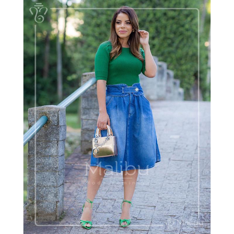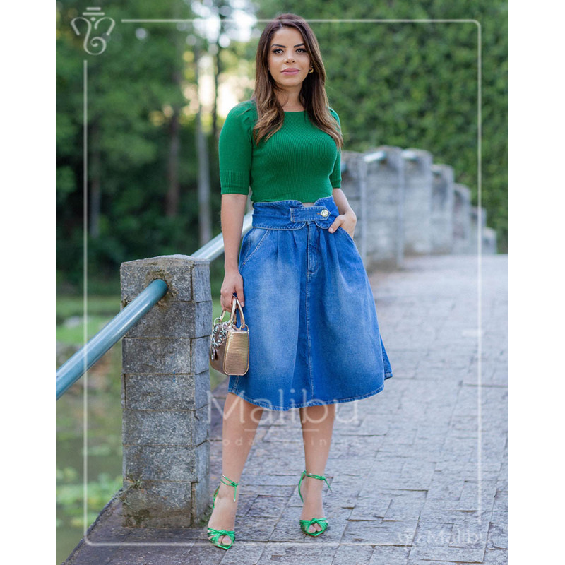 Saia Midi feita em Jeans leve com com corte evasê cintura alta clochar, possui zíper na parte de trás.