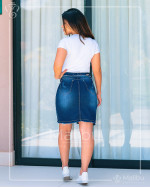 Saia no estilo média assimétrica, confeccionada em tecido jeans com elastano (tecido com bastante elasticidade), possui fenda frontal, detalhes em destroyed (que simula um desfiado na peça) e botão e zíper.