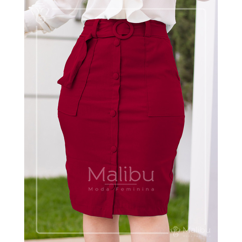 A espessura é relativamente fina, mas não é transparente. Na altura da cintura possui passantes e cinto no tecido e na cor da saia em cintura alta. O comprimento é médio, o corte é lápis,é na cor marsala, possui botões frontais decorativos encapados, bolsos laterais, não possui zíper, não possui forro.