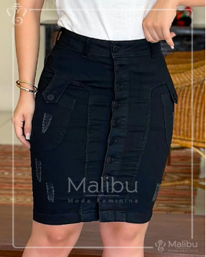 Saia média no estilo reta, confeccionada em tecido jeans na cor preta com elastano (tecido com bastante elasticidade). Possui fechamento frontal em botões encapados, detalhes em destroyed e bolsos.