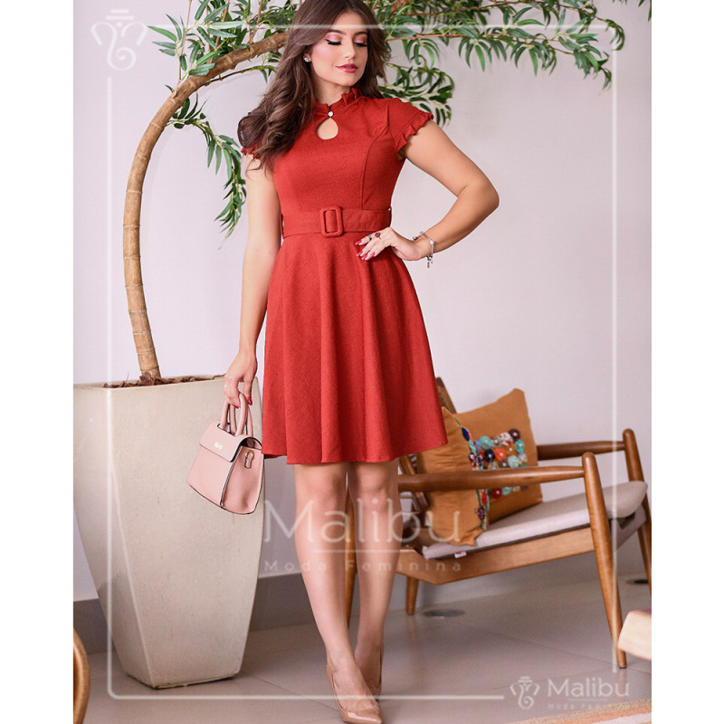 Jussara é um lindo godê feito em malha crepe (tecido com elastano) na cor telha e uma linda abertura em forma de gota na altura da gola.