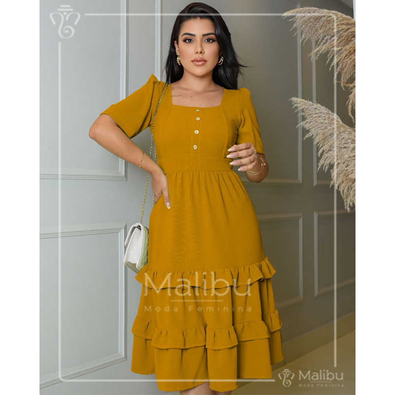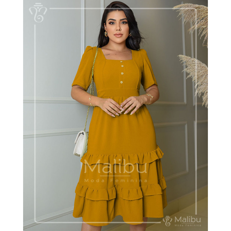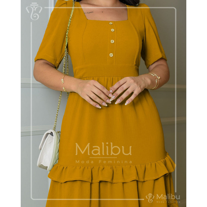 Vestido em Viscolinho gola recorte quadrado com comprimento midi e sai 2 Marias. Modelo com ótimo caimento, possui forro.