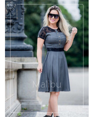 Vestido godê em Chambray na cor cinza com renda na mesma cor do vestido.