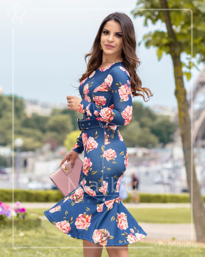 Vestido confeccionado em tecido malha crepe com um lindo recorte na altura da gola, possui fundo azul e barra estampada.
