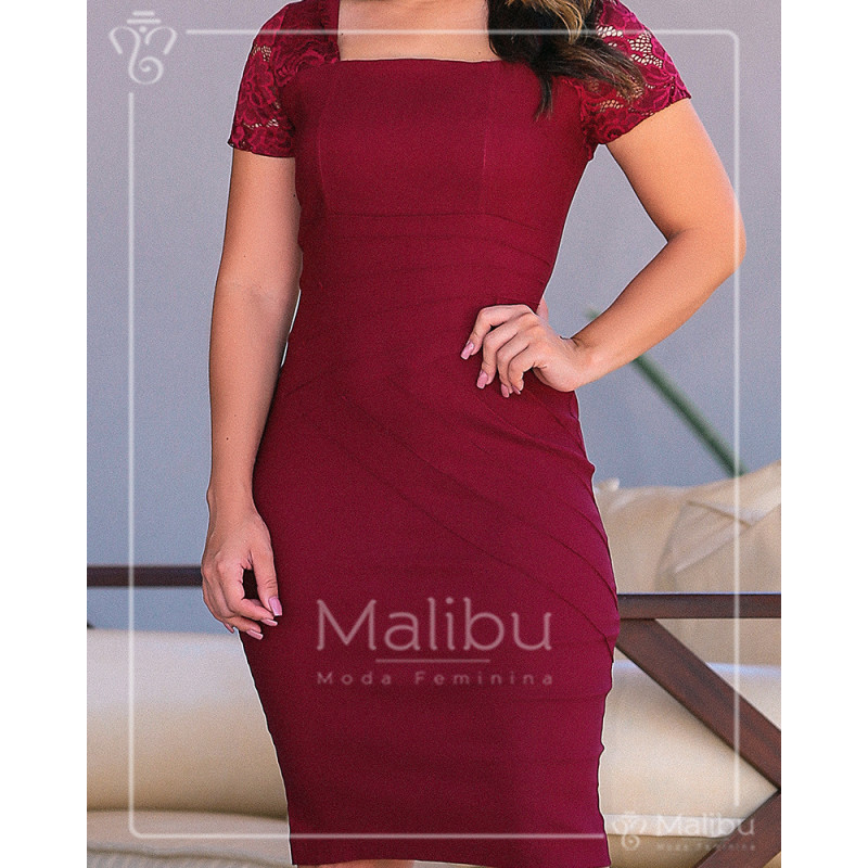 Magali é um tubinho marsala feito em tecido de bengaline, o busto possui decote reto, as mangas e costas com renda, dando aquele efeito de “Casaquinho” rendando. Para finalizar um acabamento perfeito da peça na altura da cintura possui Viés na cor do tecido modelando o corpo. Modelo lindo, confortável e veste muito bem possui zíper nas costas e não tem forro.