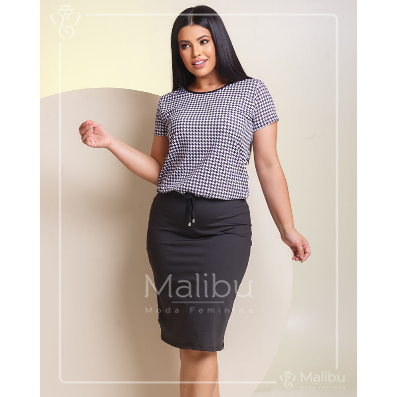 "Vestido blusado com comprimento médio, confeccionado em tecido suplex, oferecendo conforto e ajuste perfeito ao corpo. O modelo possui uma estampa mini xadrez discretas na parte superior, com manga curta, e uma saia lisa e ajustada ao corpo, destacando a silhueta de forma elegante. Ideal para quem busca um visual sofisticado e modesto, perfeito para ocasiões especiais e encontros religiosos. Disponível em tamanhos variados, é uma peça versátil e atemporal para o guarda-roupa feminino evangélico."