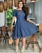 "Vestido Midi com manga curta no estilo godê, confeccionado em tecido chambret na cor azul jeans. Na parte da frente possui detalhes em botões e um charme de drapeado no decote.