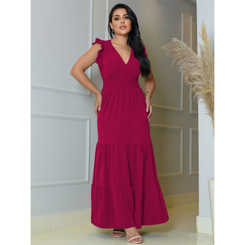 Elegante e feminino, este vestido longo rosa fucsia em crepe é a escolha perfeita para quem busca um visual sofisticado e confortável. Com modelagem acinturada que valoriza a silhueta, ele possui decote transpassado em “V” e delicados babados nas mangas, adicionando um toque romântico ao look. A saia com recortes e leve franzido garante movimento e fluidez, ideal para ocasiões especiais, cultos ou eventos sociais.